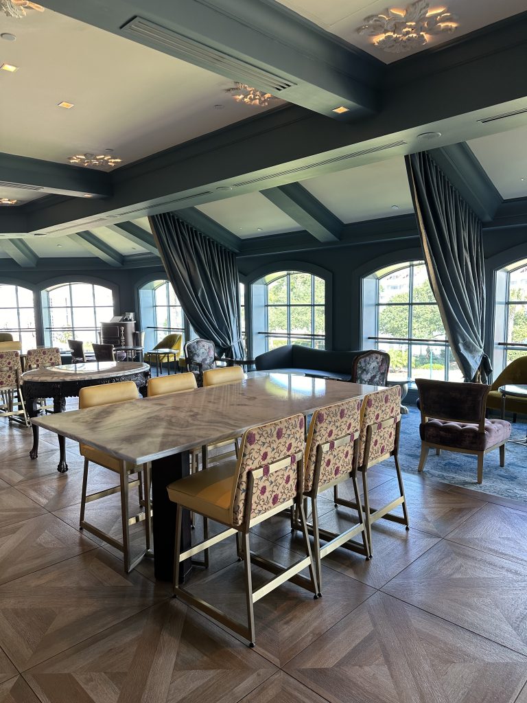 Once inside the resort, head up to the second floor, where you’ll find the Enchanted Rose lounge just waiting to greet you. With its delicate chandeliers, cozy seating, and subtle nods to Beauty and the Beast, it’s impossible not to feel the magic as soon as you arrive.